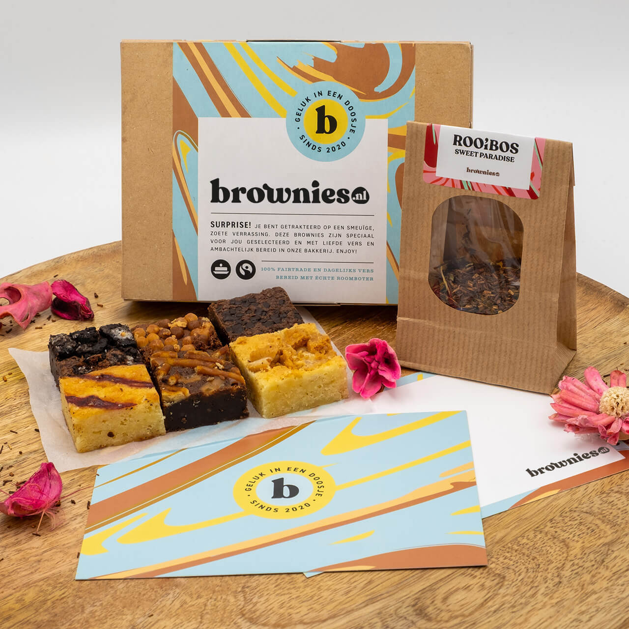 Bij onze brownies hoort natuurlijk een lekker warm drankje, daarom hebben we een box samengesteld met brownies én thee! Geniet van onze 6 meest populaire brownies smaken, vergezeld met een heerlijk kopje zoete rooibos thee erbij! Onze Theebox bevat een 20 gram Rooibos Sweet Paradise thee: een (losse) thee die heerlijk zoet smaakt én ruikt, en er prachtig uitziet! Daarnaast zitten er 6 Mini’s brownies in deze box in de smaken: